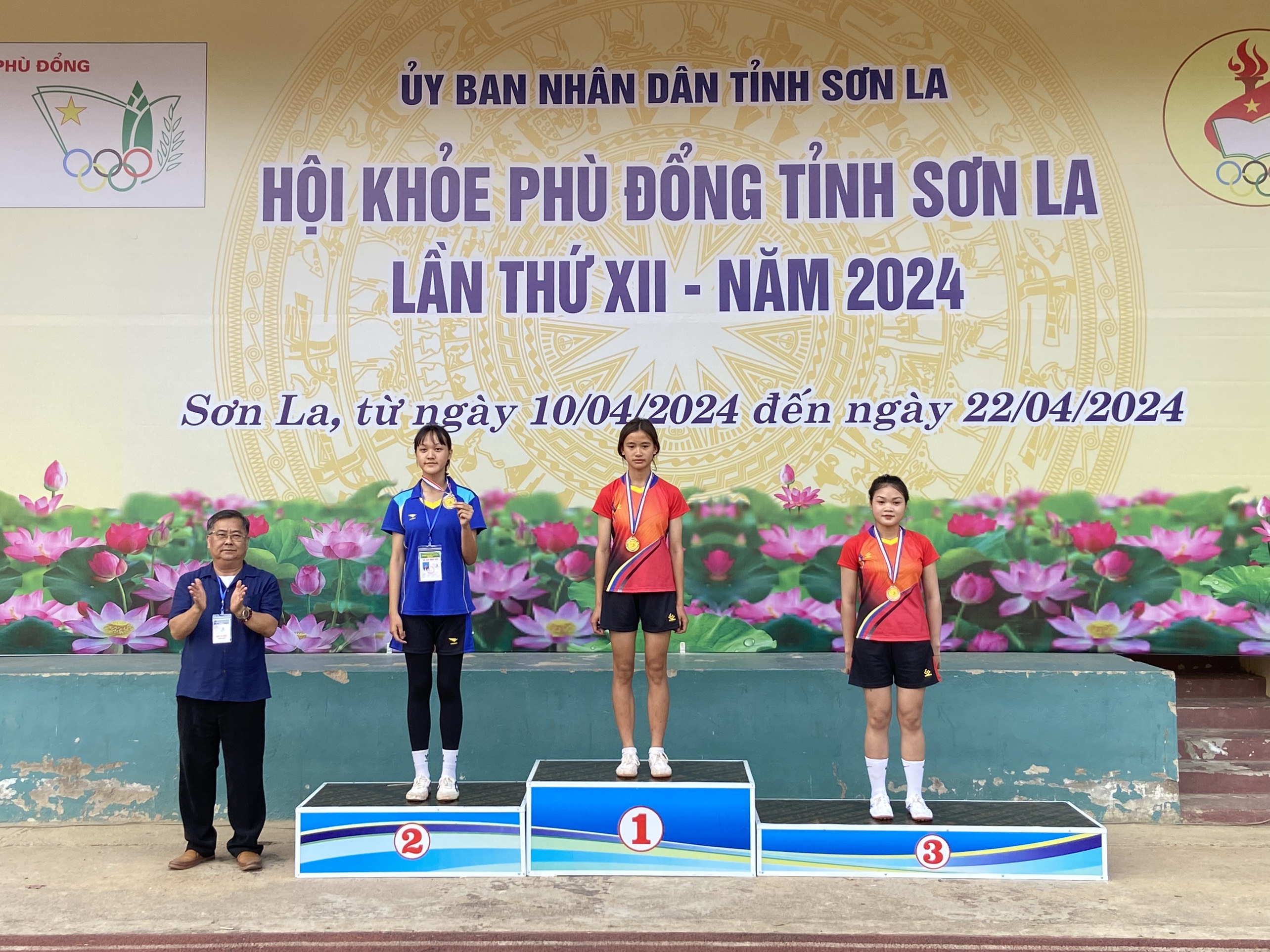 Vận động viên Hoàng Minh Huyền, Trường TH-THCS Chiềng Mai (người đứng giữa) - Huy chương vàng nội dung 200m, 400m, Kéo co nam-nữ; Huy chương bạc nội dung kéo co nữ